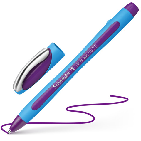 Kugelschreiber Slider Memo XB. Kappenmodell. Typbezeichnung der Mine: neuartige Fluid-Paste. Ausführung Mine: XB, schwarz, dokumentenecht. Ausführung Stift: Kunststoff gummiert. Ausführung Clip: Metall, silber. Durch die ViscoGlide®-Technologie gleitet der Slider seidenweich übers Papier. Farbe des Schaftes: cyan-violett.
