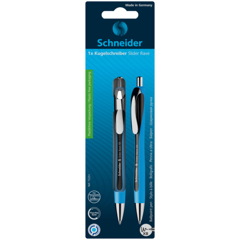 Kugelschreiber Slider Rave. Druckmechanik. Typbezeichnung der Mine: Slider 755 (ISO-Format G2) mit verschleißfester Edelstahlspitze. Ausführung Mine: XB, schwarz, dokumentenecht, Mine auswechselbar. Ausführung Stift: Kunststoff, gummierte Oberfläche. Clip: Metall, silber. Ergonomische Form. Viscoglide®-Technologie für außergewöhnlich weiches und gleitendes Schreiben. Schneider Kugelschreiber und Minen mit dem Plug+Play-Symbol sind untereinander kompatibel. Das macht den Minenwechsel spielend einfach. Farbe des Schaftes: cyan-schwarz. Ausführung des Inhalts mit Packung: 1er Blisterkarte.