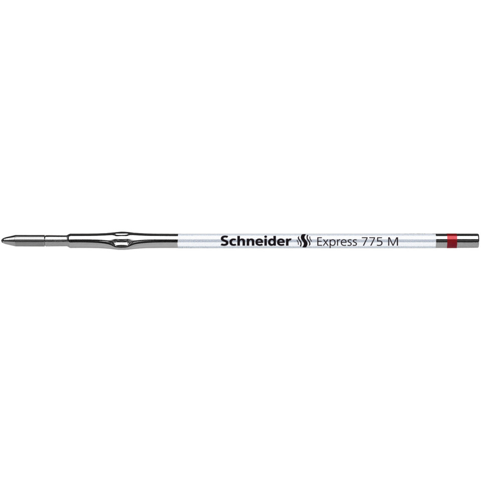 Kugelschreibermine EXPRESS 775. Verwendung für Produkt: Passend in alle Schneider Kugelschreiber-Modelle und Gelschreiber mit universeller Passform "Plug & Play", sowie viele am Markt befindliche Kugelschreiber mit X 20-System. Typbezeichnung der Mine: Standardmine in Premium-Ausführung. Ausführung Mine: M, rot, dokumentenecht. Typbezeichnung der Mine gemäß ISO-Norm: ISO 12757-2 H. Material des Schaftes: Metallmine. Länge: 107 mm. Die verschleißfeste Edelstahlspitze garantiert, dass der große Pasteninhalt vollständig und schmierfrei genutzt werden kann.