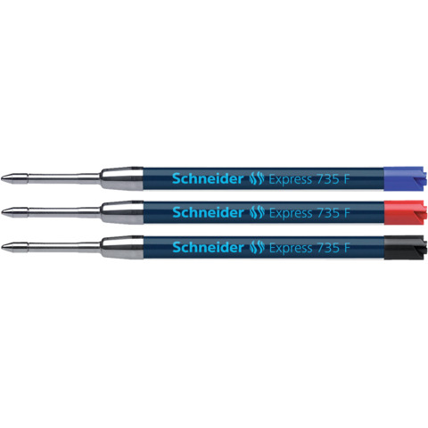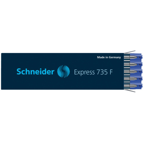 Kugelschreibermine Express 735. Verwendung für Produkt: Passend in alle Schneider Kugelschreiber-Modelle und Gelschreiber mit universeller Passform Plug+Play, sowie viele am Markt befindliche Kugelschreiber mit G2-System. Typbezeichnung der Mine: Großraummine ISO-Format G2. Ausführung Mine: F, blau, dokumentenecht. Typbezeichnung der Mine gemäß ISO-Norm: ISO 12757-2. Material des Schaftes: Metallmine. Länge: 98 mm. Die verschleißfeste Edelstahlspitze garantiert, dass der große Pasteninhalt vollständig und schmierfrei genutzt werden kann.