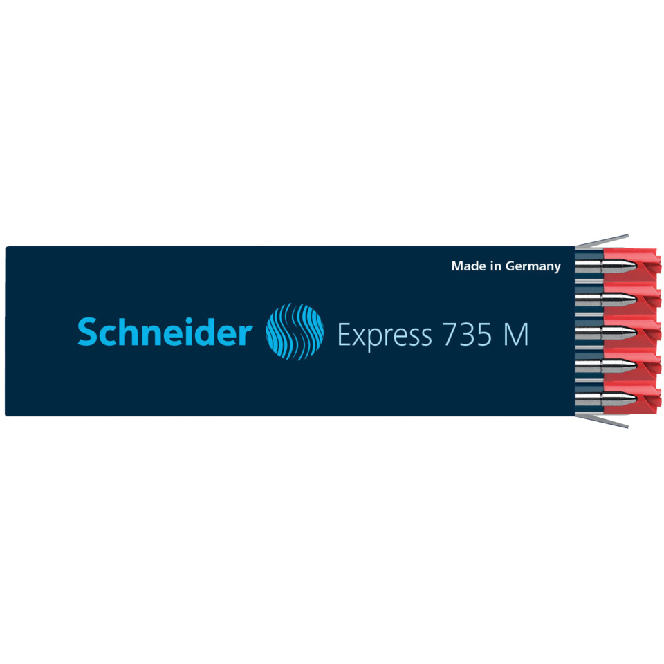 Kugelschreibermine Express 735. Verwendung für Produkt: Passend in alle Schneider Kugelschreiber-Modelle und Gelschreiber mit universeller Passform Plug+Play, sowie viele am Markt befindliche Kugelschreiber mit G2-System. Typbezeichnung der Mine: Großraummine ISO-Format G2. Ausführung Mine: M, rot, dokumentenecht. Typbezeichnung der Mine gemäß ISO-Norm: ISO 12757-2. Material des Schaftes: Metallmine. Länge: 98 mm. Die verschleißfeste Edelstahlspitze garantiert, dass der große Pasteninhalt vollständig und schmierfrei genutzt werden kann.