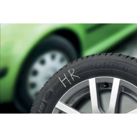 Lackmarker Maxx 270. Art der Schreibflüssigkeit: Tinte auf Alkoholbasis ohne Toluol und Xylol, wasserfest, 300 °C, lichtbeständig gegeben. Ausführung Spitze: Rundspitze, Spitze austauschbar. Für raue und glatte Oberflächen, z.B. Papier, Kunststoff, Glas, Metall, Keramik, etc. Sehr gute Haftung und Abriebbeständigkeit auf fast allen Materialien. Beständig gegen viele Ätzmittel und Waschvorgänge. Ventilgesteuerter Tintenfluss. Material des Schaftes: Kunststoff. Kappe umsteckbar. Farbe des Schaftes: tiefblau-weiß. Strichstärke: 1-3 mm. Schreibfarbe von Schreibgeräten: weiß.
