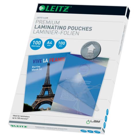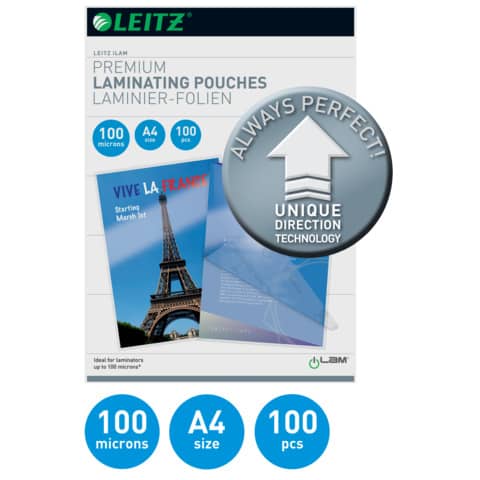 Leitz LaminierfolieA4 UDT 100 micron, mit UDT (Unique Direction Technology), mit aufgedruckten Pfeilen für die Einlegerichtung, um das Laminieren zu erleichtern, der Aufdruck verschwindet nach dem Laminiervorgang. Material: Ethyl-Vinyl-Acetat (EVA). Inhalt: 100 Stück. Farbe: glasklar.