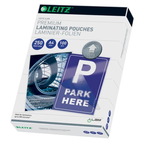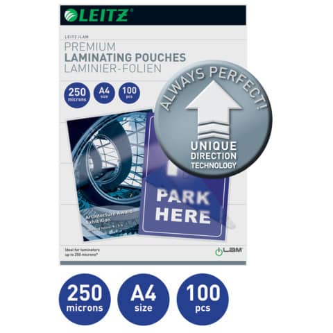Leitz Laminierfolie A4 UDT 250 micron, mit UDT (Unique Direction Technology), mit aufgedruckten Pfeilen für die Einlegerichtung, um das Laminieren zu erleichtern, der Aufdruck verschwindet nach dem Laminiervorgang. Material: Ethyl-Vinyl-Acetat (EVA). Inhalt: 100 Stück. Farbe: glasklar.