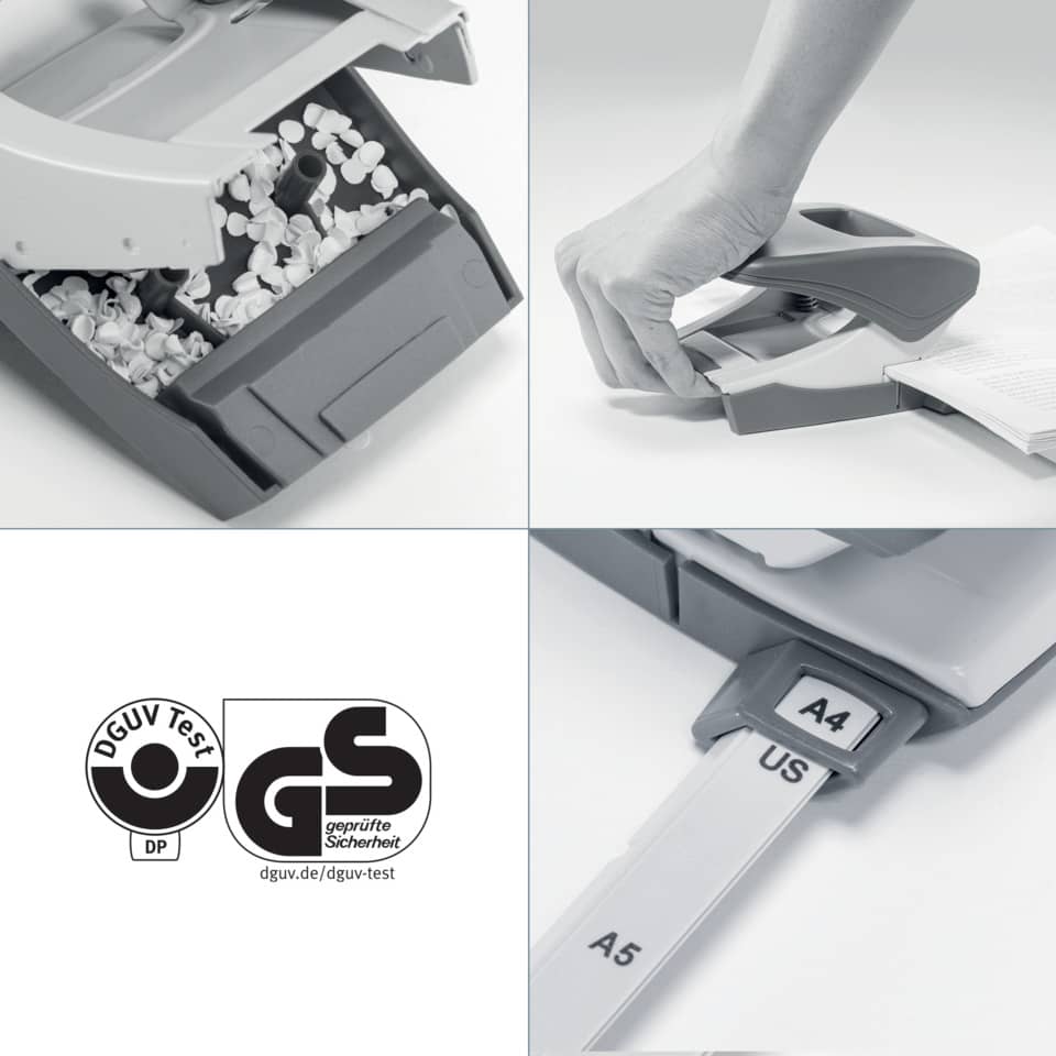 | Besonderheiten: | Anschlagschiene mit farbiger Bedruckung und Fenster, mit transprarentem, rutschfestem Kunststoffboden (Abfallkasten), mit patentierter Griffmulde und ultra-scharfen Lochstempeln, auch für 4-fach Lochung geeignet |