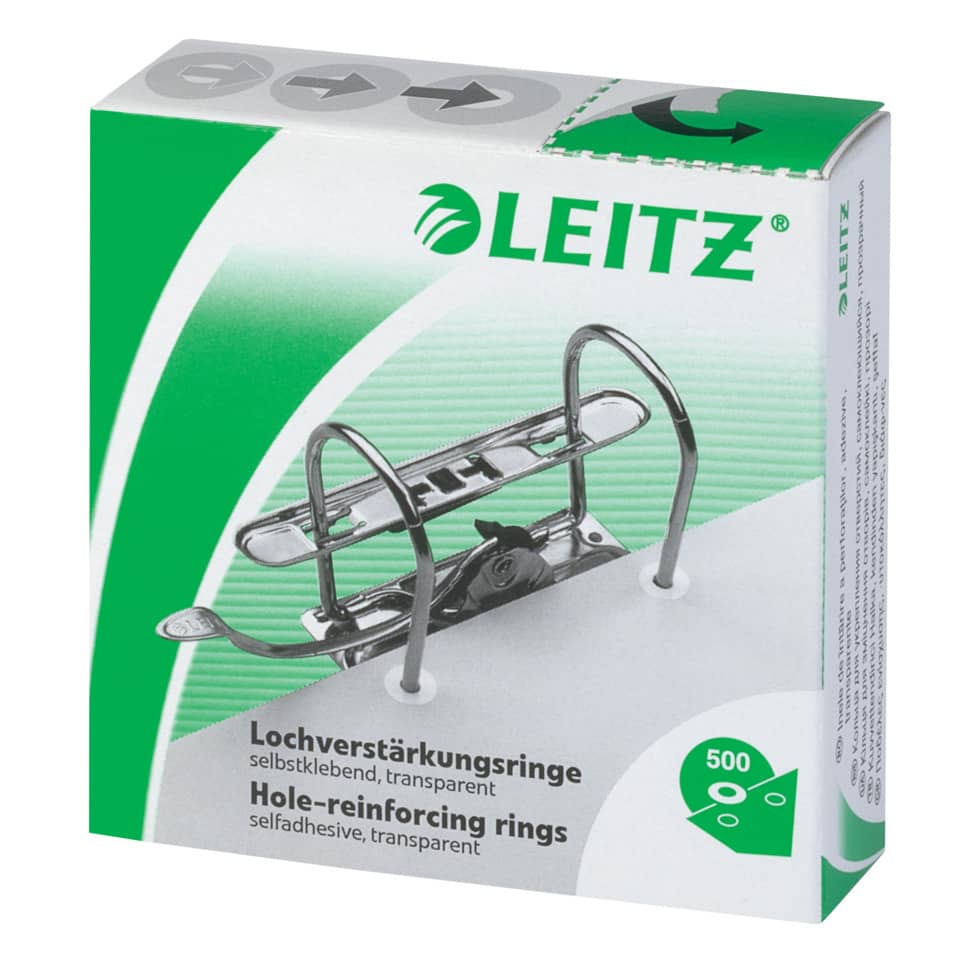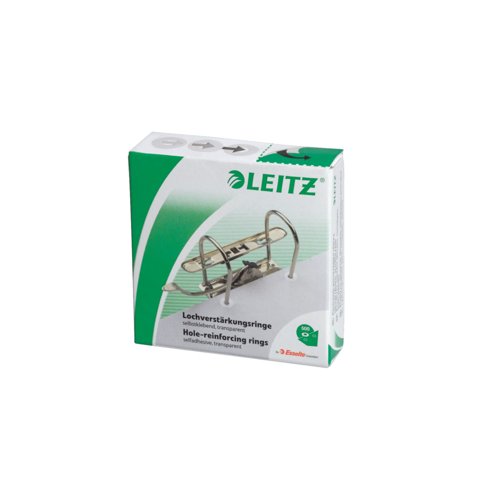 Leitz Lochverstärkungsringe, selbstklebend, lösungsmittelfrei, zum Verstärken der Lochung. Material: Polypropylen (PP). Farbe: weiss transparent.
