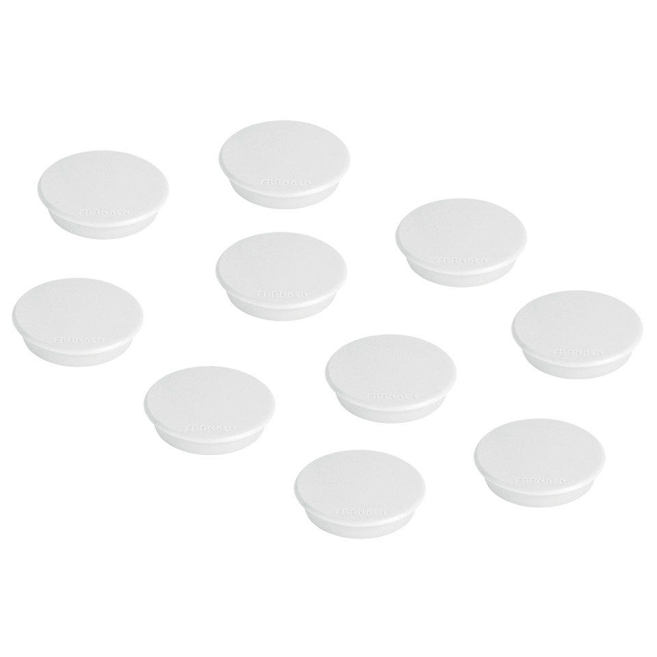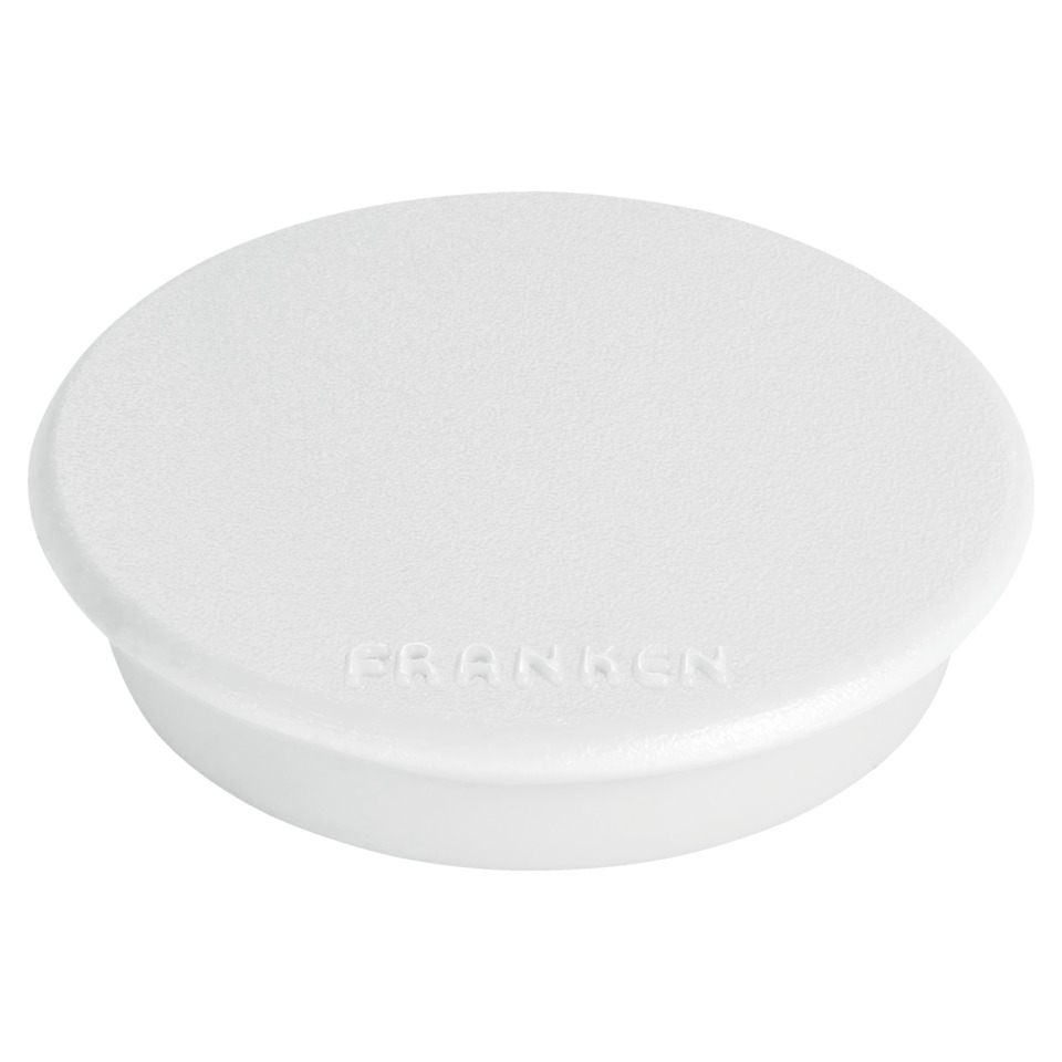 Franken Magnet. Rund. Hält bis zu 4 Blatt Papier (80 g/qm DIN A4). Zum Anheften von Notizen und Aushängen. Lackierte Unterseite zum Schutz der magnethaftenden Oberfläche. Mit Kunststoffkappe. Haftkraft: 300 g. Durchmesser: 24 mm. Inhalt: 10 Stück. Farbe: weiß.