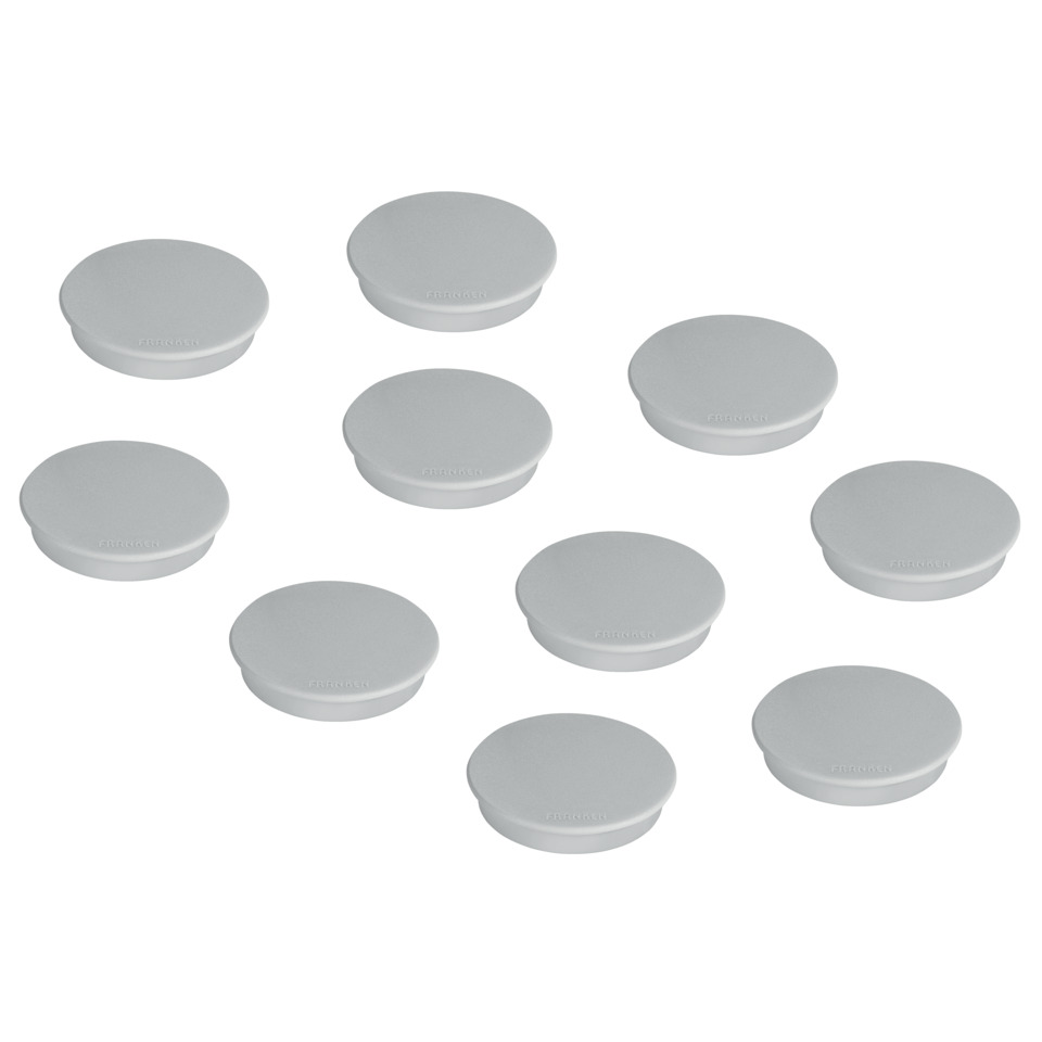 Magnet. Sonderform: rund. Für bis zu 7 Blatt DIN A4, 80 g/qm. Größe (B x H) oder ( Ø ): 32 mm. Tragfähigkeit: 800 g. Farbe: grau. Ausführung des Inhalts mit Packung: Karton mit 10 Stück.