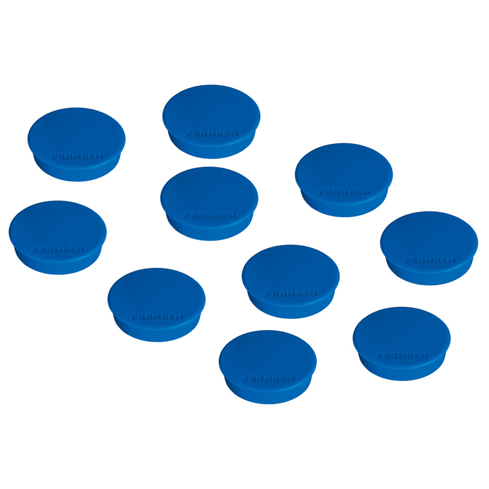 FRANKEN Magnet. Rund. Hält bis zu 10 Blatt Papier (80 g/qm DIN A4). Zum Anheften von Notizen und Aushängen. Lackierte Unterseite zum Schutz der magnethaftenden Oberfläche. Mit Kunststoffkappe. Haftkraft: 1500 g. Durchmesser: 38 mm. Inhalt: 10 Stück. Farbe: blau.