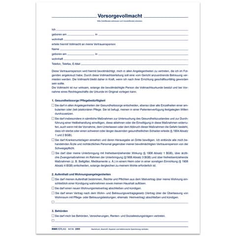 Besonderheiten: | Patientenverfügung, Vorsorgevollmacht, Betreuungsverfügung, Anmeldung zum Vorsorgeregister, Hinweiskarten und Erläuterungen |