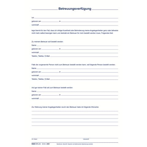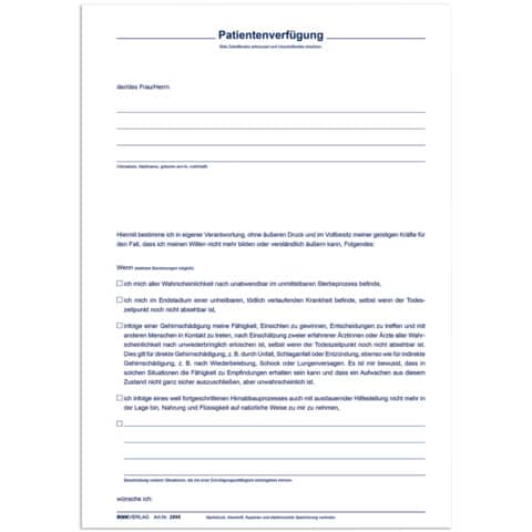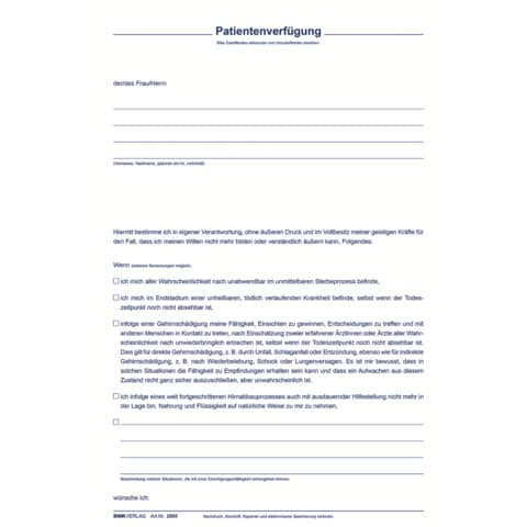 Mappe "Meine Patientenverfügung", DIN A4, dunkelblau. Patientenverfügung, Vorsorgevollmacht, Betreuungsverfügung, Anmeldung zum Vorsorgeregister, Hinweiskarten und Erläuterungen. Art des Verschlusses: kein. Werkstoff: Feinstkarton. Stärke: 1 mm. Verwendung für Papierformate: DIN A4. Größe (B x H x T): 225 x 310 x 6 mm. Farbe: dunkelblau. Max. Füllhöhe an Papier: 3 mm. Art der Verpackung und Inhalt: 1 Stück.
