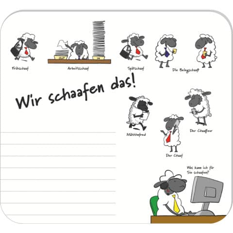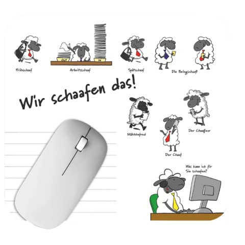 Mousepad - Block "Wir schaafen das!" Maße (BxH): 240 x 220 mm, 30 Blatt. Ausführung: Rechteckig, rutschfest. Geleimter Block aus Papier mit 30 Blatt, recyclebar. Werkstoff: Papier. Größe (B x H x T): 240 x 4 x 220 mm. Typbezeichnung des Motivs: "Wir schaafen das!". Farbe: bunt.