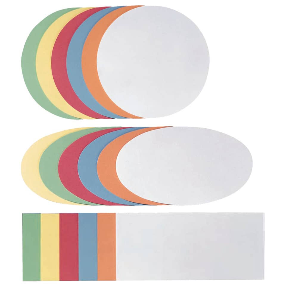 FRANKEN Moderationskarte Oval. Format: 190 x 110 mm. Material: 100% Altpapier, 130 g/qm. Inhalt: 250 Stück. Farbe: sortiert: weiß, gelb, orange, rot, hellblau, hellgrün.