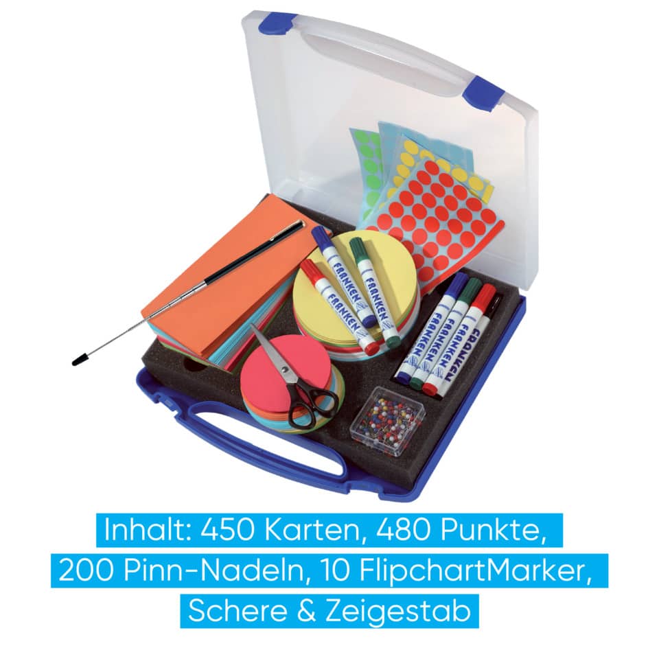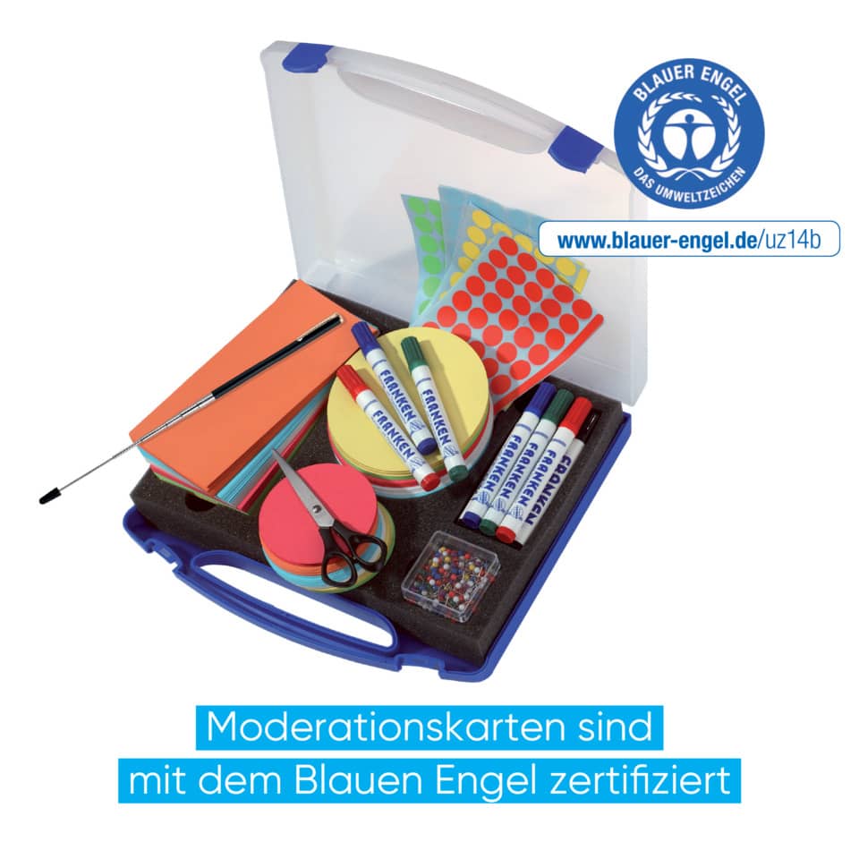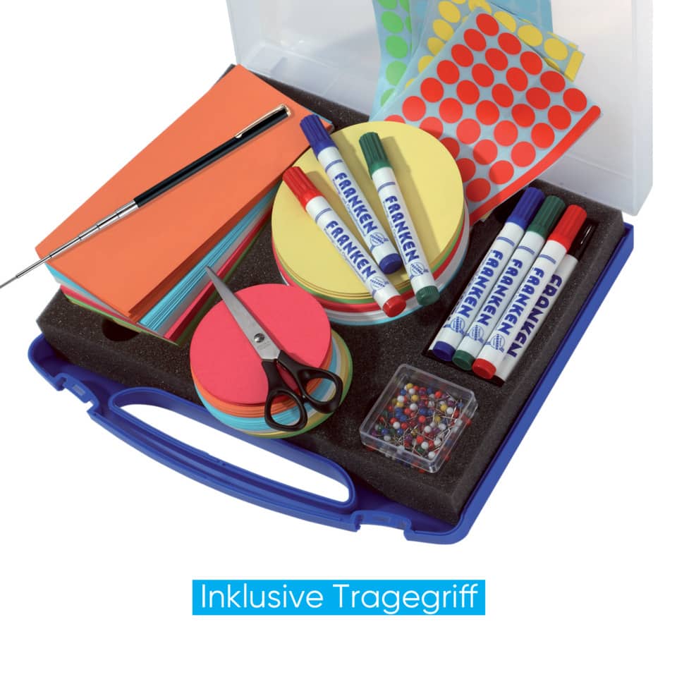FRANKEN Moderationskoffer Mini. Kunststoffkoffer mit Tagegriff. 1142 Teile. Bestehend aus: 150 Kreise Ø 9,5 cm, 150 Kreise Ø 14 cm, 150 Rechtecke 9,5 x 20,5 cm, je 120 Markierungspunkte in gelb, rot, blau und grün, je 2 FlipchartMarker in rot, blau, grün und 4 in schwarz, 200 Pinnnadeln mit Rundkopf, 1 Schere, 1 Laserpointer mit integriertem Kugelschreiber. Format: 345 x 60 x 310 mm. Farbe: blau.