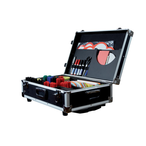 FRANKEN Moderationskoffer Trainer. Aluminiumkoffer mit Teleskopauszug und 2 Rollen, arretierbarem Kunststoffgriff, abschließbar. 3156 Teile. Bestehend aus: 20 Wolken 25 x 42 cm, 250 Kreise Ø 9,5 cm, 250 Kreise Ø 14 cm, 250 Kreise Ø 19,5 cm, 500 Rechtecke 9,5 x 20,5 cm, 250 Ovale 11 x 190 cm, 250 Rhomben 9,5 x 20,5 cm, je 520 Markierungspunkt in rot und grün, je 2 JumboMarker in rot, blau, grün und schwarz, je 15 FlipchartMarker in rot und schwarz, 300 Pinnnadeln mit Rundkopf, 1 Nadelkissen, 1 Kreppband, 1 Klebefilmabroller, 2 Klebestifte, 1 Cutter, 1 Schere, 1 Laserpointer mit integriertem Kugelschreiber. Format: 540 x 180 x 360 mm. Farbe: schwarz.