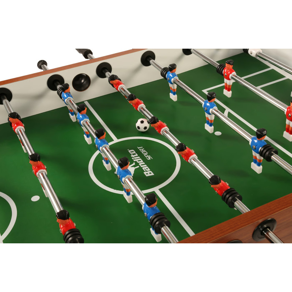 Der Bandito Multi-9 Spieltisch vereint neun beliebte Spieleklassiker in einem Tisch: Kicker, Poolbillard, Tischtennis, Speedhockey, Bowling, Shuffleboard, Backgammon, Black Jack, Schach und Dame. Der stabile MDF-Korpus mit Melaminbeschichtung und höhenverstellbaren Beinen sorgt für Langlebigkeit und Komfort. Als Kickertisch bietet er einen 360° rotierenden Torwart, integrierte Torzähler und zwei Bälle. Der Poolbillardtisch verfügt über grünes Tuch, gummierte Banden und ein komplettes Zubehörset mit Queues, Kugeln und Kreide. Der Tisch lässt sich einfach durch Auflegen verschiedener Spielflächen umfunktionieren. Netz, Schläger und Bälle für Tischtennis sowie Handgriffe und Pucks für Speedhockey sind inklusive. Mit Maßen von 145 x 130 x 90 cm und 75 kg Gewicht ist der Multi-9 robust und vielseitig. Die Montage der Beine, Stangen und Figuren erfolgt selbst.