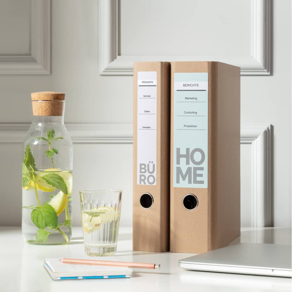 Recycling Ordner-Etiketten, Home Office, Kleinpackung. Anwendung: Ordnen, Organisieren. Format: 38 x 192 mm. Klebstoff: permanent. Drucker: Inkjet, Laser s/w, Farblaser. Form: rechteckig mit abgerundeten Ecken. Farbe: naturweiß. Material: Papier. Nachhaltigkeit: chlorfrei gebleicht, Blauer Engel, Recycling. Größe: A4. Blatt / Packung: 10. Pro Bogen: 7 Etiketten. Inhalt gesamt: 70 Etiketten