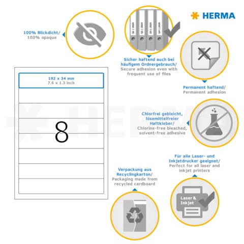 Ordneretiketten auf A4-Blättern, selbstklebend. Für ein einheitliches Erscheinungsbild im Büro und Zuhause. Für alle gängigen Ordner geeignet. Absolut blickdichtes Material mit hohem Weißgrad, alte Ordnerbeschriftungen scheinen nicht durch. Blanko: Ideal für Firmenlogo, Beschriftungen und Ordnungsvermerke. Sicher haftend, auch bei häufigem Ordnergebrauch. Umweltfreundlich: hochwertiges, chlorfrei gebleichtes Spezialpapier, PEFC-zertifiziert, lösemittelfreier Haftkleber. Etiketten sind 100 % recyclingfähig mit dem Altpapier, Verpackung aus Recyclingkarton. Sehr gute Druckergebnisse auf allen Laser- und Inkjetdruckern, Kopierern, Farblaserdruckern und Farbkopierern. Störungsfreie Verarbeitung durch Rundum-Sicherheitskante und optimale Planlage. Kostenlose Softwarelösungen: www.herma.de/software. Packung mit 200 Etiketten.