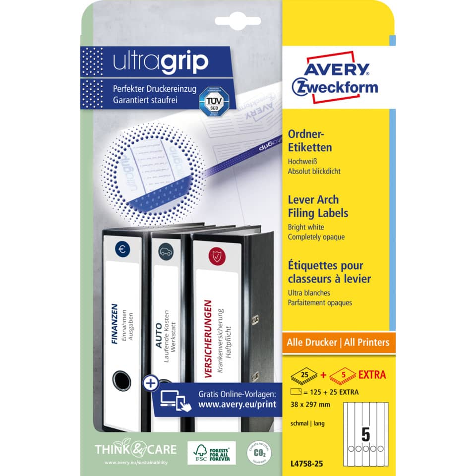 Produktinformationen "Ordnerrückenschild permanent, 38 x 297 mm, schmal/lang, 125 Stück, weiß AVERY ZWECKFORM L4758-25"