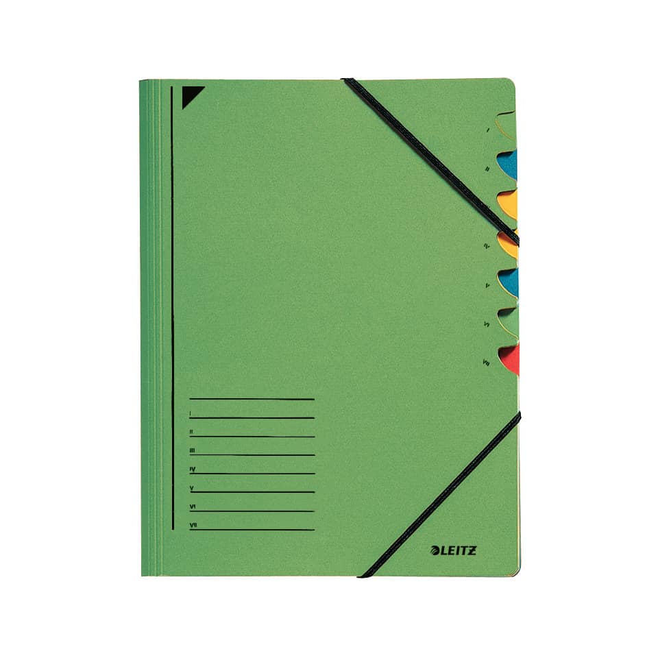 Leitz Ordnungsmappe, 7 Fächer. Mit elastischem Gummiband über den Vorderdecklecken und farbigen Greifausschnitten. Material: Einband aus 100% Pendarec-Karton 430 g/qm (RC), Fächerblock aus 100% Pendarec-Karton 350 g/qm (RC). Format: 320 x 245 mm. Farbe: grün.