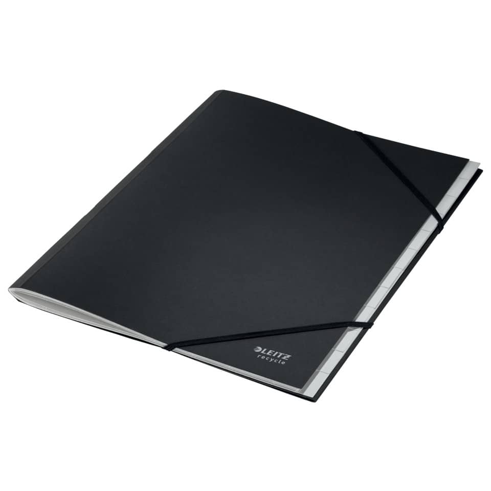 Leitz Ordnungsmappe Recycle. 12 Fächer. Hergestellt aus zu 100% recyceltem Karton und zu 100% recycelbar (nach Entfernen der Gummizüge). Mit Inhaltsverzeichnis auf der Klappe des Rückdeckels innen. Mit elastischen Gummizügen über den Ecken des Vorderdeckels. Kein Verpackungsabfall, Kennzeichnung nur mittels Etikett. Material: Einband: 100% recycelter Karton 430 g/qm (RC), Fächerblock: 100% recycelter Karton 275 g/qm (RC). Format: für DIN A4, 247 x 320 x 20 mm. Farbe: schwarz.