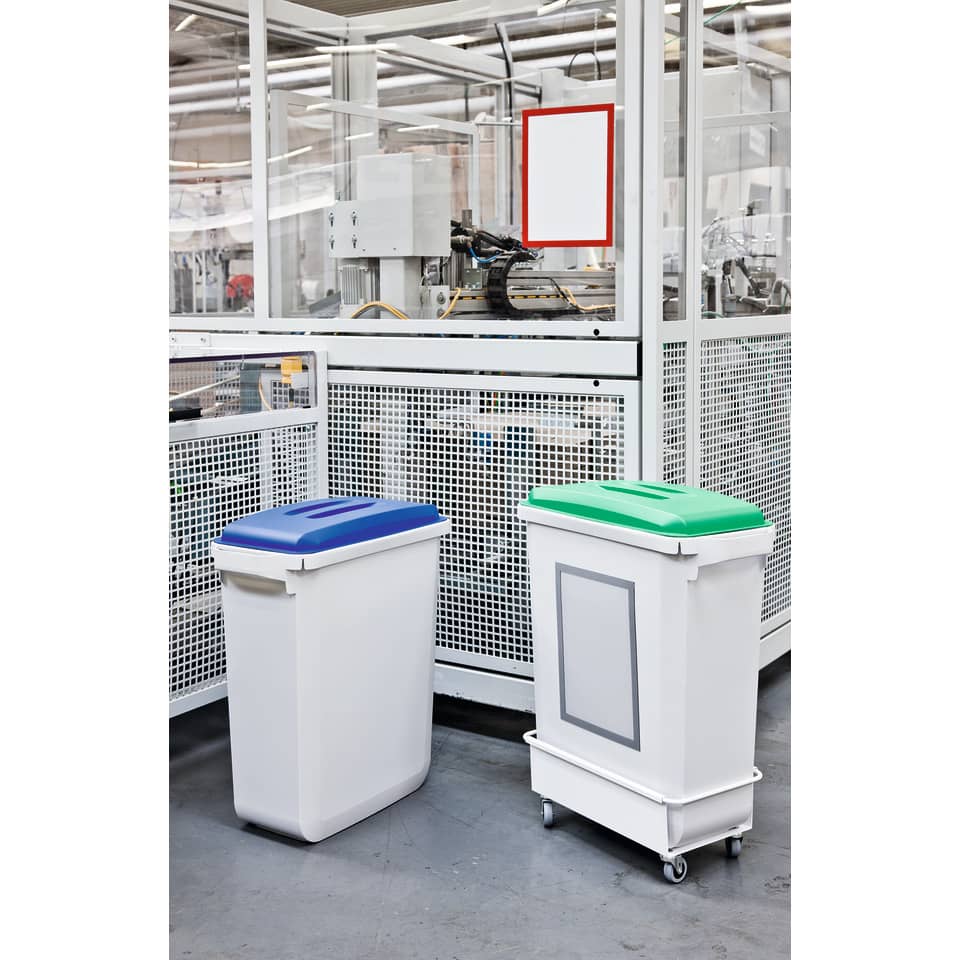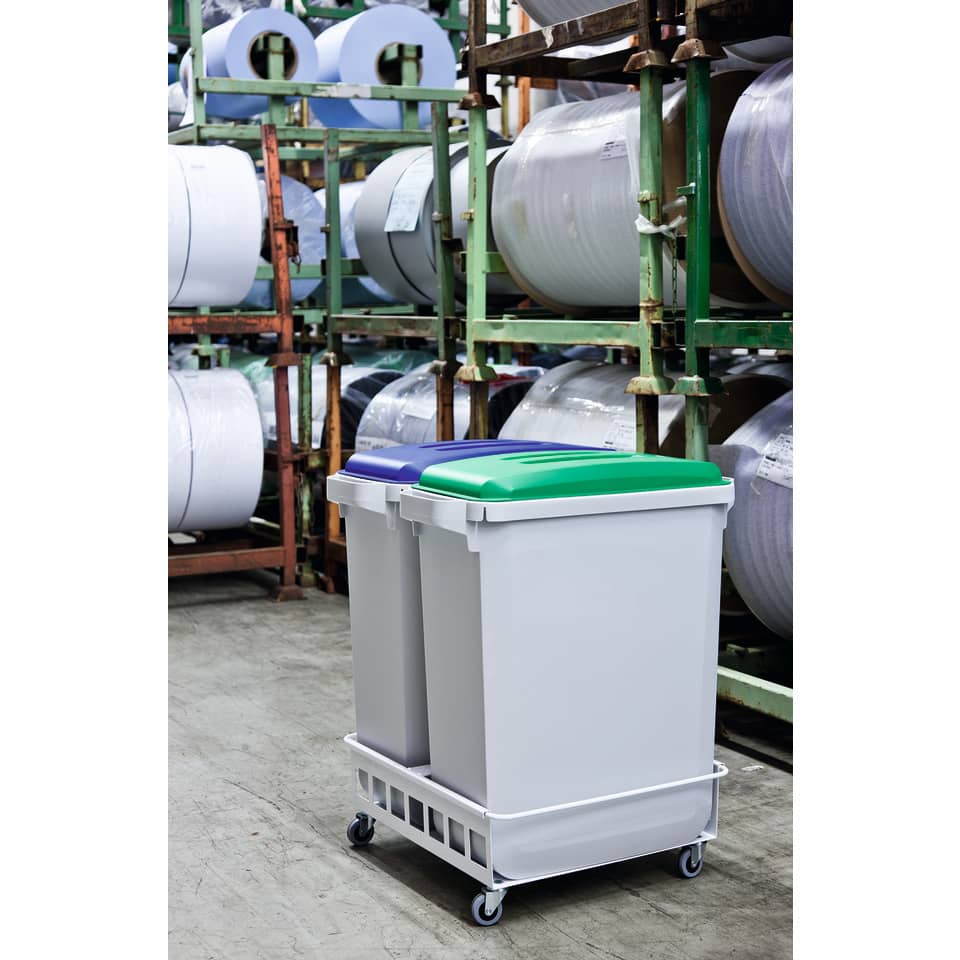 Fahrwagen DURABIN® 60L. Fahrwagen für einen Abfallbehälter DURABIN® 60 rechteckig. Aus mindestens 80% recyceltem Polypropylen (Ausgenommen die Lenkrollen). Geeignet für den Innen- und geschützten Außenbereich. Nutzbar auf ebenen Flächen in Lager, Produktionsbereichen, Kantinen etc.. Mit 4 Lenkrollen, zwei davon mit Bremse. Mit beiliegenden Verbindern verkettbar mit Fahrwagen DURABIN® 60L rPP und/oder Fahrwagen DURABIN® 90L rPP (maximal 4 Wagen in Reihe). Belastbar bis 80 kg.