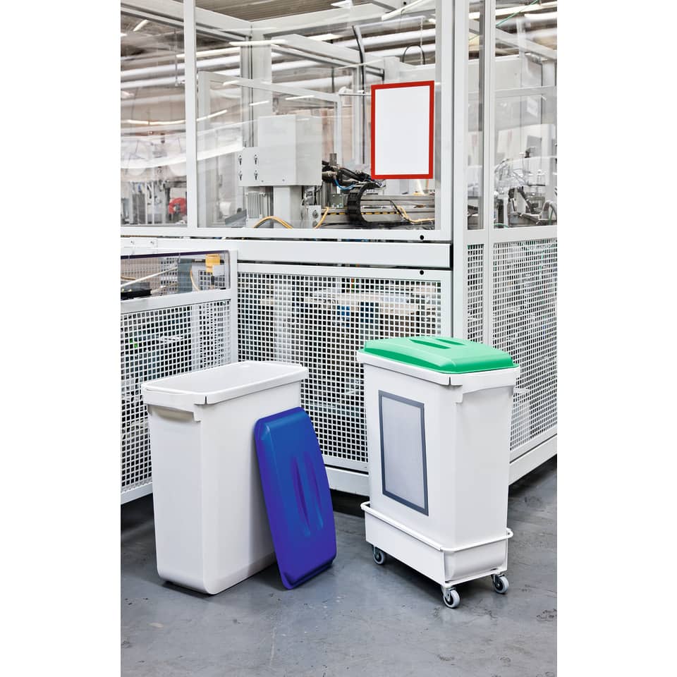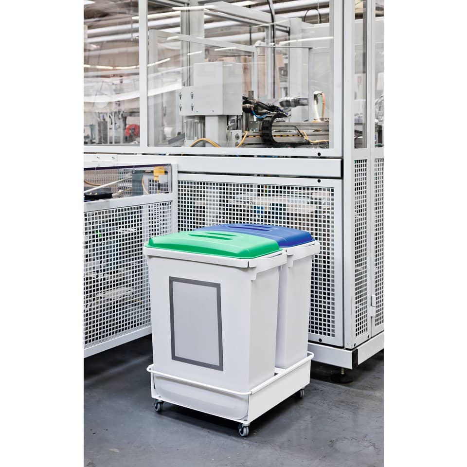 Fahrwagen DURABIN® 60L. Fahrwagen für einen Abfallbehälter DURABIN® 60 rechteckig. Aus mindestens 80% recyceltem Polypropylen (Ausgenommen die Lenkrollen). Geeignet für den Innen- und geschützten Außenbereich. Nutzbar auf ebenen Flächen in Lager, Produktionsbereichen, Kantinen etc.. Mit 4 Lenkrollen, zwei davon mit Bremse. Mit beiliegenden Verbindern verkettbar mit Fahrwagen DURABIN® 60L rPP und/oder Fahrwagen DURABIN® 90L rPP (maximal 4 Wagen in Reihe). Belastbar bis 80 kg.