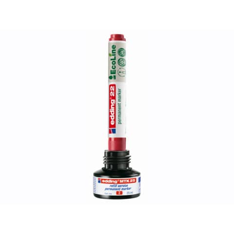 Permanentmarker 22 EcoLine. Nachfüllbar. Geruchsarme Tinte ohne Zusatz von Xylol/Toluol, wasserfest, lichtbeständig. Keilspitze, Spitze austauschbar. Kunststoffteile insgesamt zu mindestens 96% aus recyceltem Material. Papieretikett. Marker mit Filtersystem. Schnell trocknend. Zum Beschriften von fast allen Oberflächen. Kappe umsteckbar, Clip vorhanden. Kappe und Mundstück in Schreibfarbe. Schaftfarbe: umweltfreundliches Design. Strichstärke: ca. 1 - 5 mm. Schreibfarbe: schwarz, rot, blau und grün.