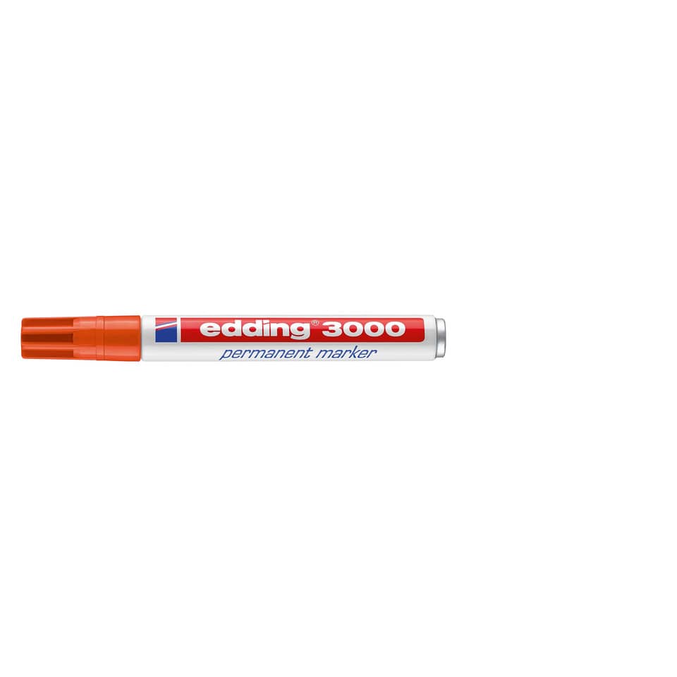 Permanentmarker edding 3000. Nachfüllbarer Marker zum Beschriften, Bemalen, Kennzeichnen von fast allen Materialien, auch Metall, Glas, Kunststoff. Permanente, geruchsarme Tusche ohne Zusatz von Toluol/Xylol, wisch- und wasserfest, lichtbeständig. Austauschbare Rundspitze. Aluminiumschaft. Umsteckbare Kappe in Schreibfarbe. Schaftfarbe: weiß . Strichstärke: ca. 1,5 - 3 mm. Schreibfarbe : orange.