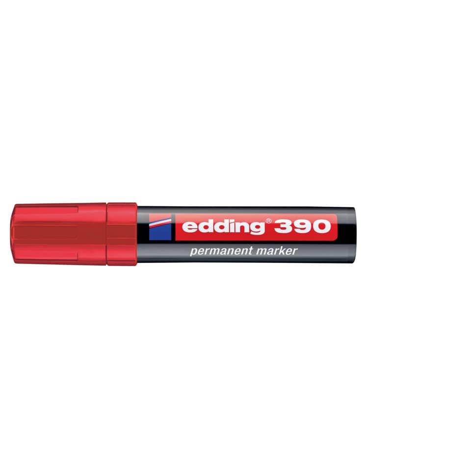 Permanentmarker edding 390. Nachfüllbarer Marker zum Beschriften, Bemalen, Kennzeichnen von fast allen Materialien, auch Metall, Glas, Kunststoff. Permanente, geruchsarme Tusche ohne Zusatz von Toluol/Xylol, wisch- und wasserfest, lichtbeständig. Keilspitze. Kunststoffschaft. Umsteckbare Kappe in Schreibfarbe. Schaftfarbe: schwarz . Strichstärke: ca. 4 - 12 mm. Schreibfarbe : rot.