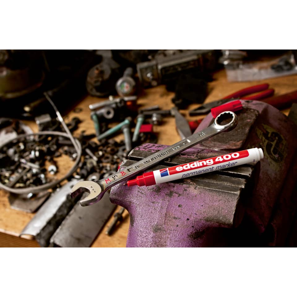 Permanentmarker edding 400. Nachfüllbarer Marker zum Beschriften, Bemalen, Kennzeichnen von fast allen Materialien, auch Metall, Glas, Kunststoff. Permanente, geruchsarme Tusche ohne Zusatz von Toluol/Xylol, wisch- und wasserfest, lichtbeständig. Austauschbare Rundspitze. Kunststoffschaft. Umsteckbare Kappe in Schreibfarbe. Schaftfarbe: weiß . Strichstärke: 1 mm. Schreibfarben: schwarz, rot, blau, grün, gelb, orange, braun, violett, rosa, hellblau.