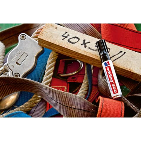 Permanentmarker edding 500. Nachfüllbarer Marker zum Beschriften, Bemalen, Kennzeichnen von fast allen Materialien, auch Metall, Glas, Kunststoff. Permanente, geruchsarme Tusche ohne Zusatz von Toluol/Xylol, wisch- und wasserfest, lichtbeständig. Austauschbare Keilspitze. Aluminiumschaft. Umsteckbare Kappe in Schreibfarbe. Schaftfarbe: weiß . Strichstärke: ca. 2 - 7 mm. Schreibfarbe : blau.