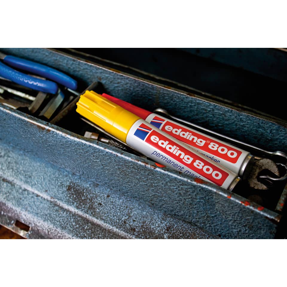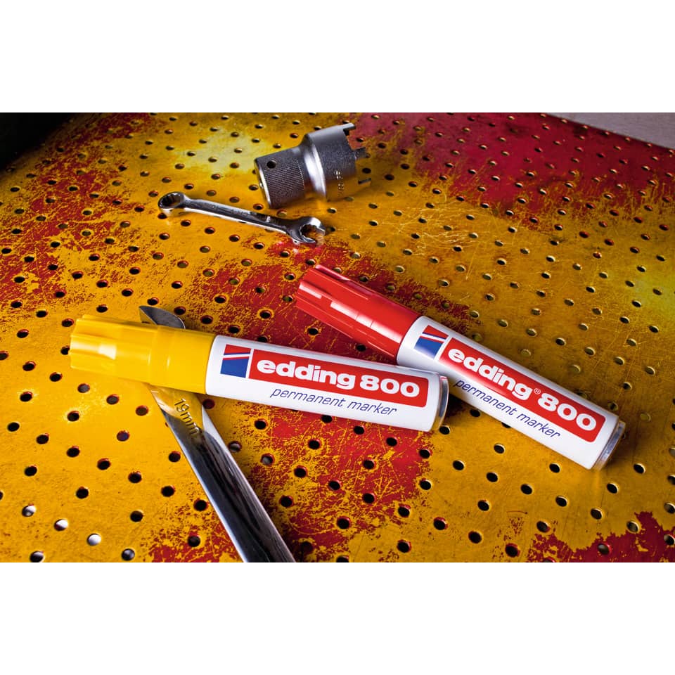 Permanentmarker edding 800. Nachfüllbarer Marker zum Beschriften, Bemalen, Kennzeichnen von fast allen Materialien, auch Metall, Glas, Kunststoff. Permanente, geruchsarme Tusche ohne Zusatz von Toluol/Xylol, wisch- und wasserfest, lichtbeständig. Austauschbare Keilspitze. Aluminiumschaft. Umsteckbare Kappe in Schreibfarbe. Schaftfarbe: weiß . Strichstärke: ca. 4 - 12 mm. Schreibfarbe : grün.