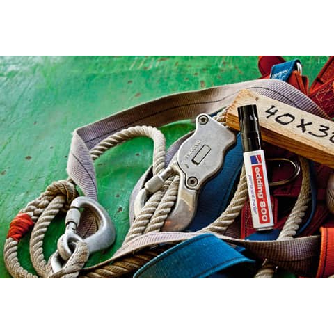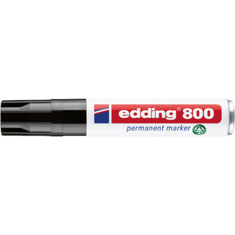 Permanentmarker edding 800. Nachfüllbarer Marker zum Beschriften, Bemalen, Kennzeichnen von fast allen Materialien, auch Metall, Glas, Kunststoff. Permanente, geruchsarme Tusche ohne Zusatz von Toluol/Xylol, wisch- und wasserfest, lichtbeständig. Austauschbare Keilspitze. Aluminiumschaft. Umsteckbare Kappe in Schreibfarbe. Schaftfarbe: weiß . Strichstärke: ca. 4 - 12 mm. Schreibfarbe : schwarz.