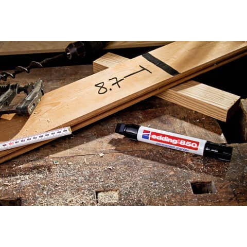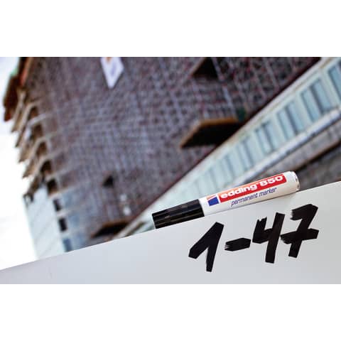 Permanentmarker zum großflächigen Markieren und Beschriften fast aller Materialien wie z. B. Papier, Karton, Metall, Glas, Kunststoff und Holz. Die Keilspitze verfügt über eine Strichbreite von 5-15 mm. Wasserfest und abriebbeständig auf fast allen Oberflächen. Das Produkt ist nachfüllbar mit edding T 25, T 100 und T 1000 Nachfülltinte. Passende Ersatzspitzen (edding 850 Ersatzspitzen) sind erhältlich. Die Tinte ist geruchsarm und ohne Zusatz von Toluol/Xylol. Hochwertiger Aluminiumschaft.