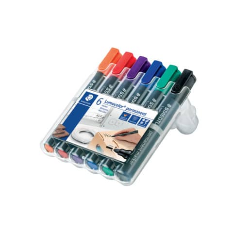 Permanentmarker Lumocolor® permanent marker. Nachfüllbar. Art der Schreibflüssigkeit: geruchsarme Tinte, xylol- und toluolfrei, wasserfest, lichtbeständig gegeben. Kann einige Tage offen liegen bleiben, ohne einzutrocknen. Ausführung der Spitze: Rundspitze. Efficient for ecology: blockierte Spitze, Schaft und Kappe aus PP garantieren lange Lebensdauer, einfaches Nachfüllen mit Tankstelle 488 50. Für fast alle Flächen. Sekundenschnell trocken, daher ideal für Linkshänder. Material des Schaftes: PP. Kappe umsteckbar. Clip vorhanden. Farbe des Schaftes: schwarz. Strichstärke: ca. 2 mm. Schreibfarbe von Schreibgeräten: schwarz, blau, rot, grün, orange, violett. Ausführung des Inhalts mit Packung: STAEDTLER Box mit 6 Farben.