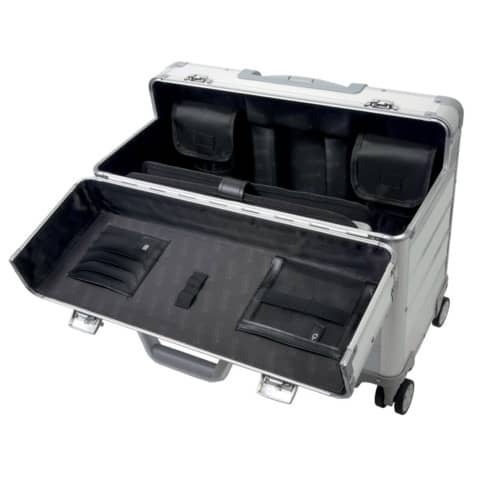 Pilotenkoffer Pandora. Vier 360° Leichtlaufrollen. Integriertes arretierbares Teleskoptrolleysystem und Tabletfach, herausnehmbares strukturiertes Inlay, zwei herausnehmbare Organizertaschen. Trolleyhöhe: ca. 103 cm. Ausstattung: mit Griff. Art des Verschlusses: Zweifachschließung und Öffnungsautomatik. Ausführung der Oberflächen-Beschaffenheit: matt. Größe (B x H x T): 470 x 360 x 250 mm. Werkstoff: Aluminium. Farbe: silber.
