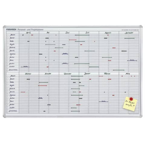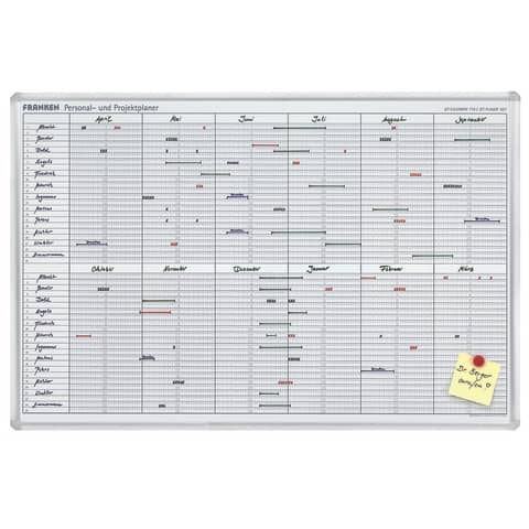 FRANKEN Planungstafel JetKalender. Planungstafel für die Personal- und Projektplanung. Horizontal: 6 Monate, Zahlen 1 bis 31 fest eingedruckt. Vertikal: 2 x 24 Positionen, Zahlen 1 bis 24 fest eingedruckt. Raster: Tagesfeld 10 x 4 mm, Indexfeld 10 x 80 mm. Magnethaftende und beschriftbare Oberfläche, feucht und trocken abwischbar. Mit Ablageschale. Lieferung inklusive Montagematerial, 1 Tafelschreiber trocken abwischbar, 1 FineMarker feucht abwischbar, 3 Haftmagnete. Material: lackierter Stahl. Rahmen: silber eloxiertes Aluminium mit hellgrauen Kunststoffecken. Format: 900 x 600 mm. 5 Jahre Garantie. Farbe: hellgrau.