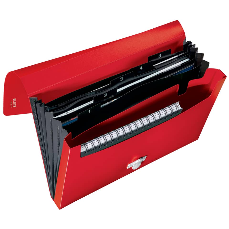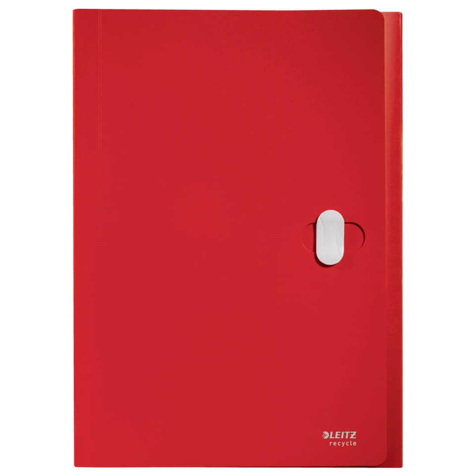 Leitz Projektmappe Recycle. Hergestellt aus 80% recyceltem Material und zu 100% recycelbar. Mit recycelbarem Sicherheitsverschluss. Für die Projektorganisation. Leicht, langlebig und wiederverwendbar. Blickdicht. 5 Fächer mit Beschriftungstaben und einem zusätzlichen Fach für die Aufbewahrung von Utensilien oder Notizbüchern. Kein Verpackungsabfall, Kennzeichnung nur mittels Etikett. Kapazität: bis zu 250 Blatt DIN A4 (80 gm). Material: 80% recyceltes Polypropylen (PP), Einband: 0,65 mm, Fächer: 0,18 mm. Format: für DIN A4, 330 x 240 x 41 mm. Farbe: rot.