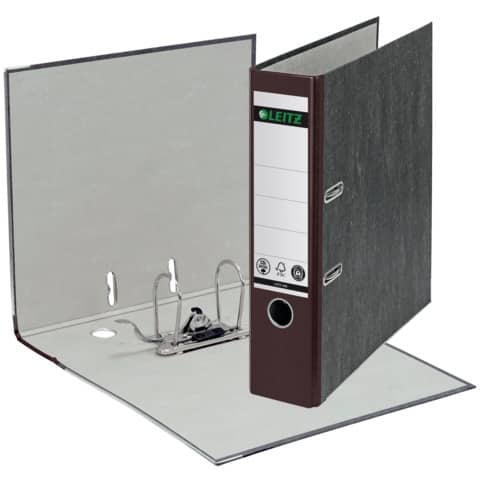 Leitz Qualitäts-Ordner breit. Der Ordner ist zu 100% recycelbar und besteht zu 100% aus recyceltem Material. Mit patentierter 180°-Präzisionsmechanik für 50% weiteres Öffnen und 20% schnelleres Arbeiten. Mit Schlitzen, Griffloch, Kantenschutz und aufgeklebtem Rückenschild. Material: Einband aus Pappe (RC), mit Wolkenmarmorpapier (RC) kaschiert. Rücken mit farbigem Spezialpapier verstärkt. Format: für A4, 318 x 285 mm, Rückenbreite: 80 mm. 5 Jahre Garantie auf die Mechanik. GS-geprüft. FSC®-zertifiziert. Farbe: braun.