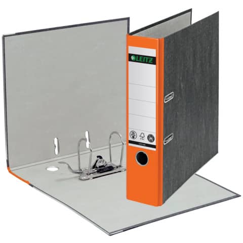 Leitz Qualitäts-Ordner breit. Der Ordner ist zu 100% recycelbar und besteht zu 100% aus recyceltem Material. Mit patentierter 180°-Präzisionsmechanik für 50% weiteres Öffnen und 20% schnelleres Arbeiten. Mit Schlitzen, Griffloch, Kantenschutz und aufgeklebtem Rückenschild. Material: Einband aus Pappe (RC), mit Wolkenmarmorpapier (RC) kaschiert. Rücken mit farbigem Spezialpapier verstärkt. Format: für A4, 318 x 285 mm, Rückenbreite: 80 mm. 5 Jahre Garantie auf die Mechanik. GS-geprüft. FSC®-zertifiziert. Farbe: orange.