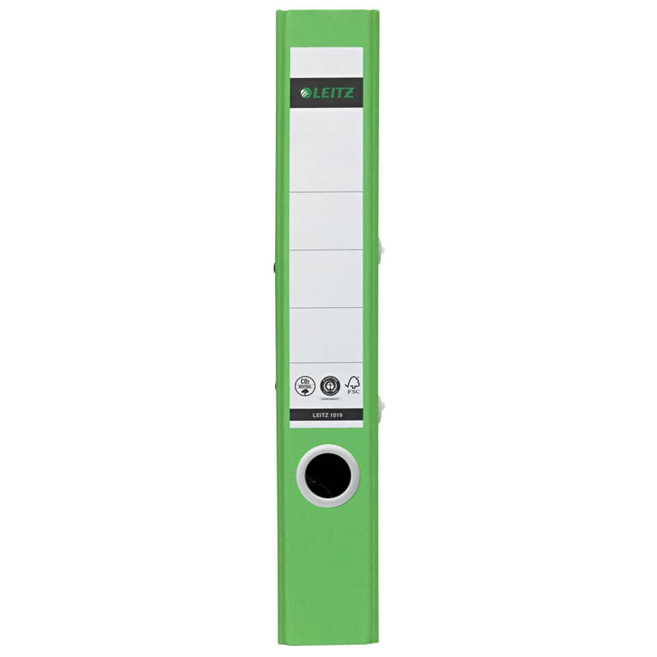 Leitz Qualitäts-Ordner Recycle 180°. Der Ordner ist zu 100% recycelbar und besteht zu 100% aus recyceltem Material. Der Ordner kann zerlegt und für das Recycling in seine Papier-, Kunststoff- und Metallbestandteile getrennt werden. Griffloch und Schlitze aus hellgrauem, recyceltem Karton. Mit selbstklebendem Rückenschild. Mit patentierter 180º-Präzisionsmechanik. 5 Jahre Garantie auf die Mechanik, GS-geprüft. 50% weitere Mechaniköffnung für schnelleres und komfortableres Arbeiten, Ablegen auch auf der linken Seite möglich. Für ca. 350 Blatt (80 g/qm). Kein Verpackungsabfall, Kennzeichnung nur mittels Etikett. Material: 100% recycelter Einband aus Graupappe (RC). Format: für DIN A4, 285 x 320 mm, Rückenbreite: 50 mm. FSC®-zertifiziert. Farbe: grün.