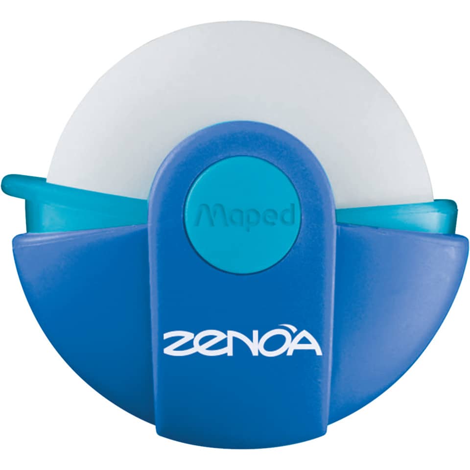 Radierer Zenoa. Werkstoff: Plastik. Produktverwendung: Blei- und Farbstifte. Verwendung für Zeichnungsträger: Papiere und Transparentfolien. Weißer Radierer in drehbarem Schutzetui für wirksamen und dauerhaften Schutz, lieferbar in verschiedenfarbigen Etuis in den Farben gelb, blau und rot. Typbezeichnung des Motivs: "Zenoa Maped". Farbe: farbig sortiert. Größe (Ø x H): 70 x 23 mm.