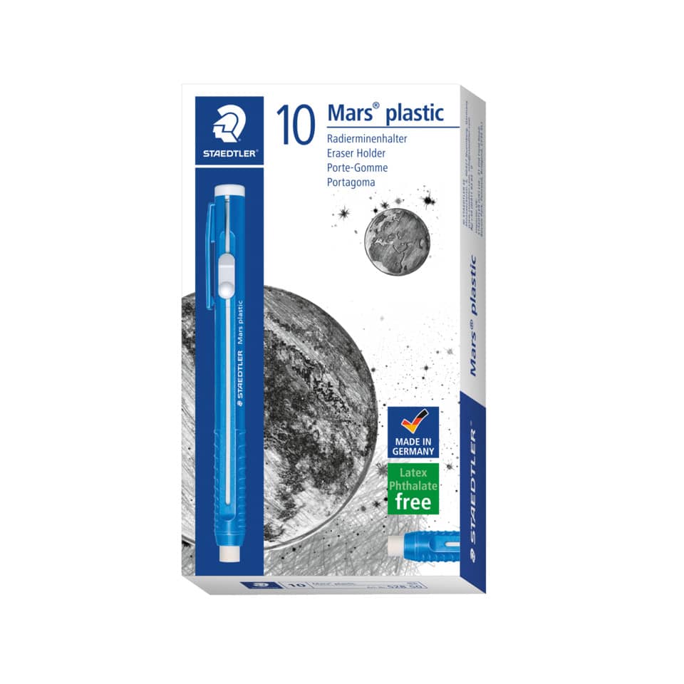 Mars® plastic Radierminenhalter, Werkstoff: PVC. Produktverwendung: für Grafit. mit Schieberegler. Ausführung Radiermine: Material des Stiftes: Kunststoff. Verwendung für Zeichnungsträger: Papier und mattierte Zeichenfolie. Länge der Radiermine: 97 mm, Farbe des Stiftes: blau. Ausführung Schaft:, Clip vorhanden. Größe Radierminenhalter (Ø x L):, Länge: 137 mm. Ausführung des Inhalts mit Packung: Schachtel mit 10 Stück