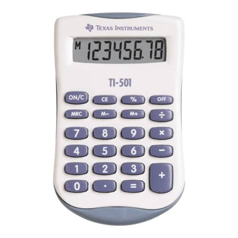Der Mini-Lifestyle-Rechner für die Hosentasche, jederzeit griffbereit. Gut lesbares achtstelliges SuperView-Display. Ergonomisches, ansprechendes, handliches Design. Speicher und %-Taste. Batteriebetrieb. APD (Automatic Power Down-automatisches Abschalten) für eine längere Lebensdauer der Batterie. Mini-Taschenrechner TI-501. Prozent- Rechnung vorhanden. Ergonomisches, ansprechendes, handliches Design. Energieversorgung: Batterie. Größe (B x T x H): 56 x 91 x 11 mm. Gewicht: 115,3 g. Farbe: Weiß/Grau. Displayanzeige: 8 Zeichen.