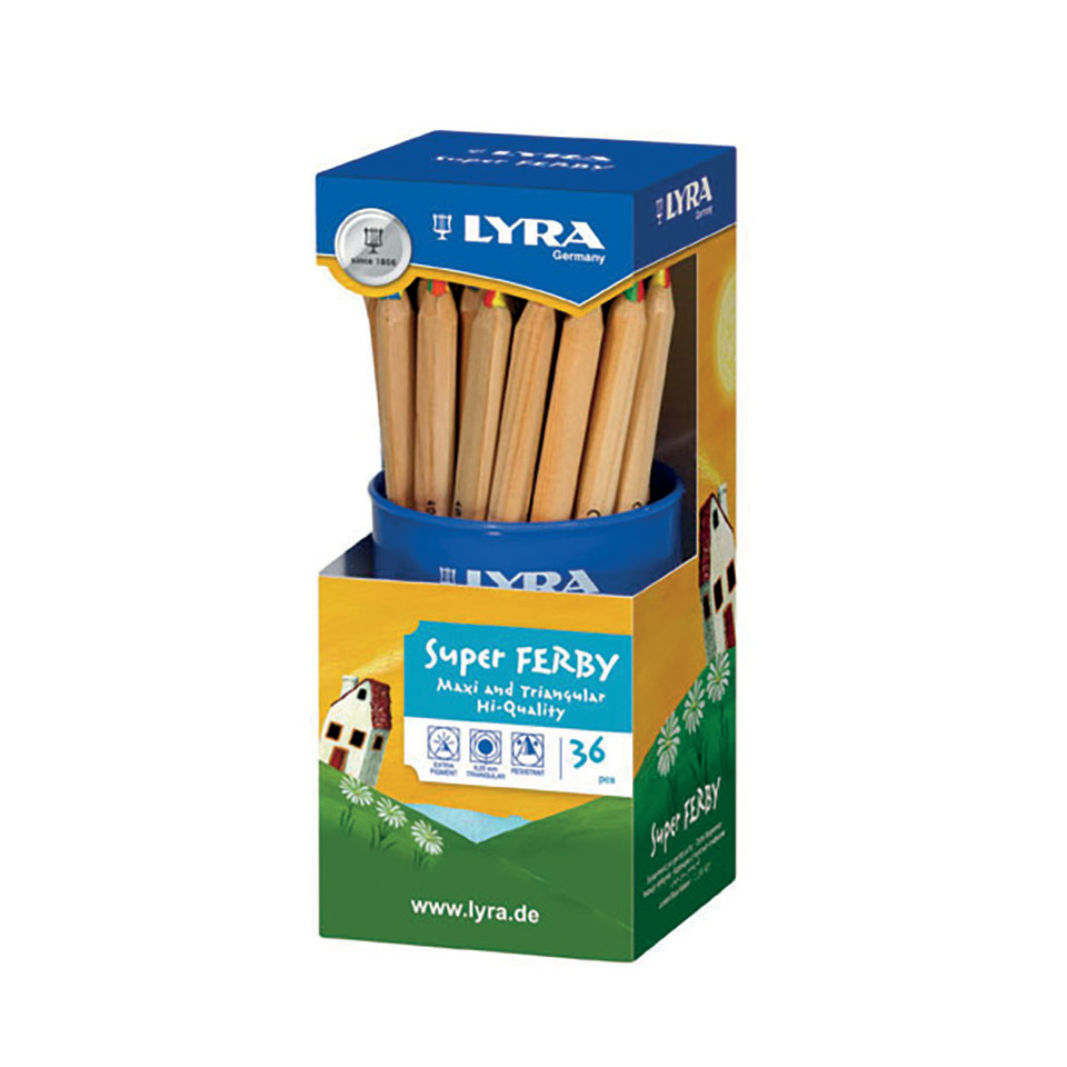 Regenbogenstift LYRA Super FERBY®. Ausführung der Schaftform: dreiflächig. Farbe des Schaftes: natur. Material des Schaftes: Holz. Größe ( Ø x L): 10 x 175 mm. Stärke der Mine: 6,25mm. Schreibfarbe der Mine: 4-Color. Ausführung des Inhalts mit Packung: Runddose mit 36 Stiften.
