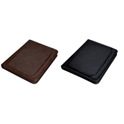 Ringbuchmappe, marmorierte Optik, A4 Einschubfach außen. Innen: Ringmechanik, Taschenrechner, Block, Stiftschlaufe, A4 Einschubfach, zwei Reißverschlussfächer, fünf Visitenkartenfächer. Außenmaße (B/T/H): ca. 340 x 270 x 40 cm.