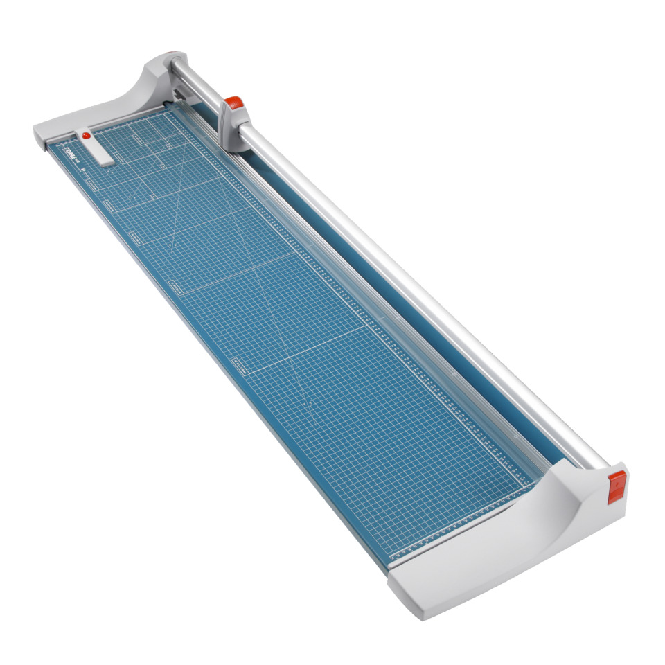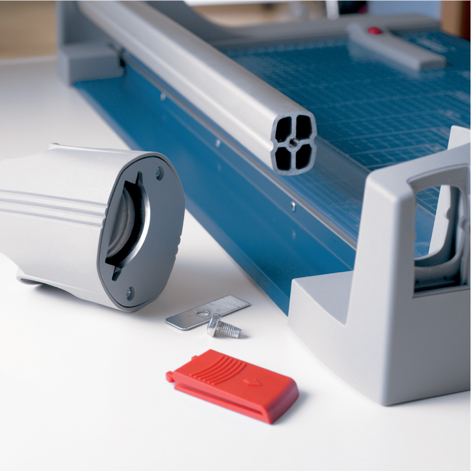Roll- & Schnitt-Schneidemaschine Dahle 448. Auswechselbarer Messerkopf vorhanden. Art der Betätigung der Pressung: automatische Pressung. Max. Papierformat: DIN A0 = 84,1 cm x 118,9 cm. Raster mit Formatgrößen vorhanden. Geschliffenes Rundmesser im geschlossenen Kunststoffkopf, geschliffenes Untermesser. Zwei Winkelanlagen, Rückanschlag. Wandmontage möglich. Masse (Gewicht): 10,0 kg. Farbe: Blau. Material des Tisches: Metall. Tischgröße (B x T): 384 x 1500 mm. Länge des Schnittes: 1300 mm. Max. Stärke des Stapels je Schnittarbeitsgang: 2,0 mm. Max. Anzahl der Blätter (70g/qm) je Schneidearbeitsgang: 20 Blatt. Max. Anzahl der Blätter (80g/qm) je Schneidearbeitsgang: 16 Blatt.