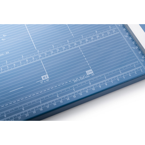Rollenschneider Dahle 552. Stabiler Metalltisch mit rutschfesten Gummifüssen. Formatlinien mit cm/inch-Einteilung, Foto-und DIN-Formate. Beidseitige Winkelanlagen und Linealorientierung. Exakt positionierbarer Rückanschlag und doppelte Führungsstange. Rückseitige Standfüsse. Automatische Pressung. Max. Papierformat: DIN A3. Geschliffenes Rund- und Untermesser aus gehärtetem Stahl, Sicherheit durch Rundmesser im geschlossenen Kunststoffkopf, Gewicht: 4.1 kg. Farbe: blau. Material des Tisches: Metall. Tischgröße (B x T): 395 x 730 mm. Länge des Schnittes: 510 mm. Max. Stärke des Stapels je Schnittarbeitsgang: 2.0 mm. Max. Anzahl der Blätter (80g/qm) je Schneidearbeitsgang: 20 Blatt. Garantie gewährt. Garantiedauer: 5 Jahre (ausgenommen Verschleißteile). GS-Prüfzeichen. 3. Generation mit doppelter Führungsstange.
