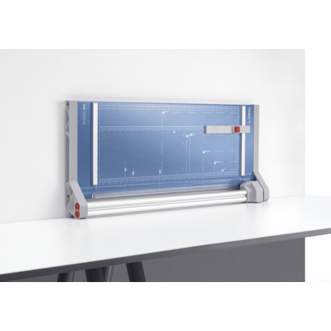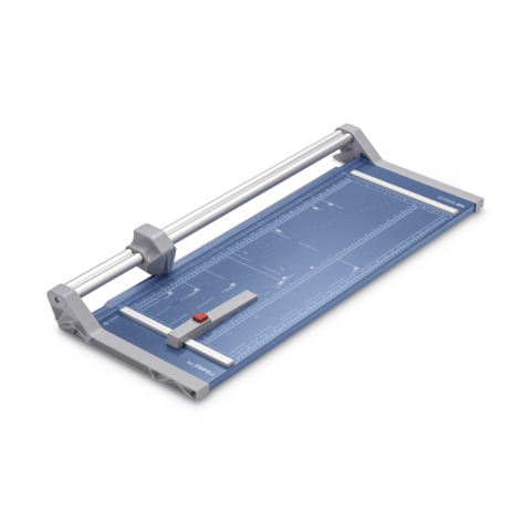 Rollenschneider Dahle 554. Stabiler Metalltisch mit rutschfesten Gummifüssen. Formatlinien mit cm/inch-Einteilung, Foto-und DIN-Formate. Beidseitige Winkelanlagen und Linealorientierung. Exakt positionierbarer Rückanschlag und doppelte Führungsstange. Rückseitige Standfüsse. Automatische Pressung. Max. Papierformat: DIN A2. Geschliffenes Rund- und Untermesser aus gehärtetem Stahl, Sicherheit durch Rundmesser im geschlossenen Kunststoffkopf, Gewicht: 5.2 kg. Farbe: blau. Tischgröße (B x T): 395 x 940 mm. Länge des Schnittes: 720 mm. Max. Stärke des Stapels je Schnittarbeitsgang: 2.0 mm. Max. Anzahl der Blätter (80g/qm) je Schneidearbeitsgang: 10 Blatt. Garantie gewährt. Garantiedauer: 5 Jahre (ausgenommen Verschleißteile). GS-Prüfzeichen. 3. Generation mit doppelter Führungsstange.